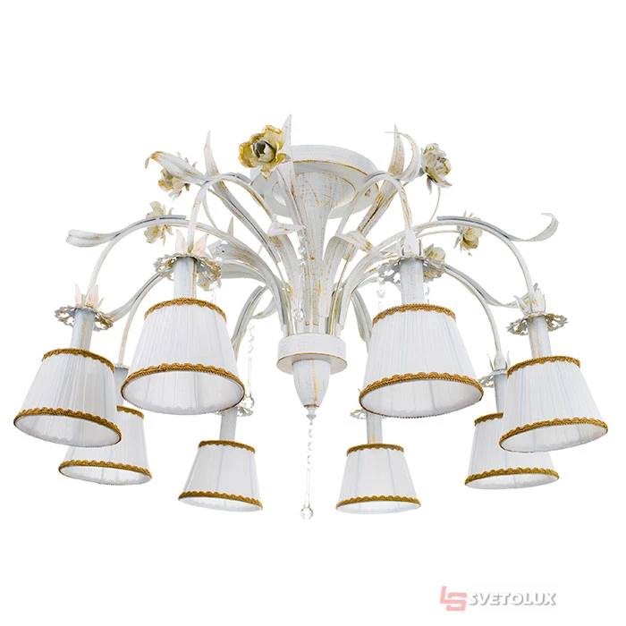 Большая люстра в стиле флористики изготовлена из прочного металлического основания и тканевых абажуров. Окрашена в белый цвет, имеет круглую форму, декорирована цветочными элементами. Для работы необходимо восемь лампочек с цоколем Е14 любого типа: светодиодные, накаливания или энергосберегающие. Крепится вплотную к потолку с помощью специальной монтажной планки (идет в комплекте). Удачно впишется в помещения, выдержанные в нежных тонах и романтическом стиле, как правило, спальни, гостиные, столовые или холлы. Вы можете купить LK-649S/8 E14 WH/G люстра в нашем интернет-магазине или обратиться по указанным номерам в Киеве, Львове, Днепре и других городах Украины.