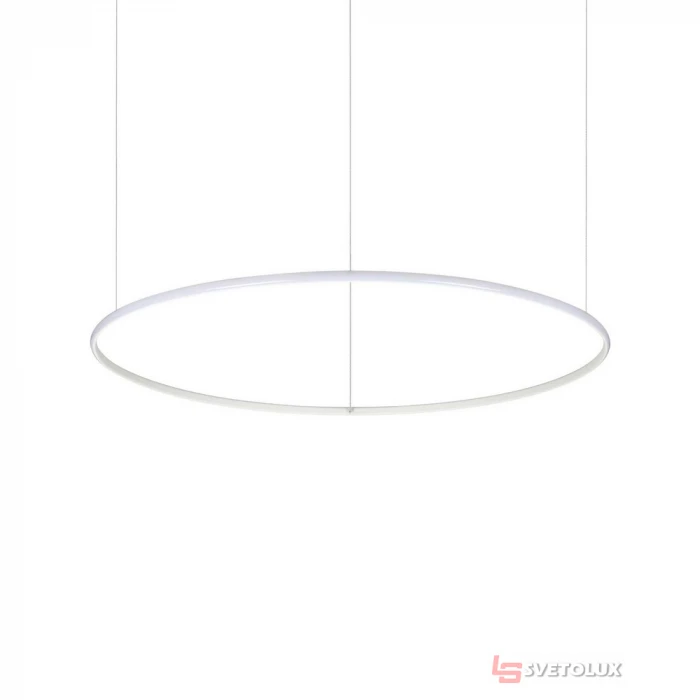 Потолочная чаша и арматура из металла порошковой окраски белого цвета. Рассеиватель из резины опала цвета. Стальные тросики c потолочными опорами. Электрический провод из прозрачного ПВХ. Размеры: D 1005 x H min 270 / max 2120 mm. Лампочка: LED 46W. Срок службы: 17500 h. Цветовая температурра: 3000 K. Световой поток: 4300 lumen. Класс защиты: IP20. Коллекция: Hulahoop collection. Арт.: P11-258751
