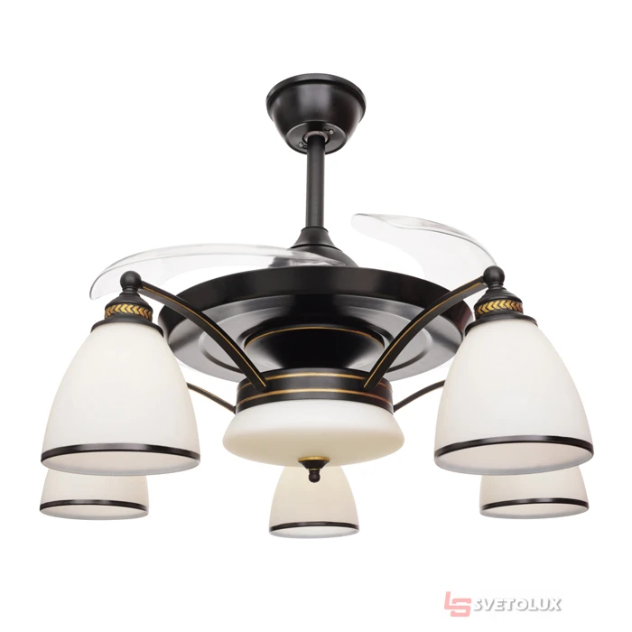 Люстра-вентилятор BKL-910S/18W+5 E27 RM это современная модель со стильным дизайном и важной дополнительной функцией. Осветительное устройство предназначено для освещения жилых и ко ммерческих помещений. Его с удовольствием установят в спальню или гостиную те, у кого нет кондиционера. Люстра вентилятор идеально подойдет для ресторанов, обустроенных на открытых террасах, для кафе с летними площадками. Корпус модели изготовлен из металла. К основанию крепится круглый короб, где находится двигатель. К коробу сверху прикреплен вентилятор, снизу 5 держателей с плафонами и подсветкой. Плафоны белого цвета, стеклянные, направляют световой поток вниз. Светодиодная подсветка установлена ??по центру, ее мощность 18 Вт. Для работы люстры требуется 5 лампочек с цоколем Е27 мощностью: 60 Вт. Подойдут светодиодные, энергосберегающие и лампы накаливания. Вентилятор изготовлен из крепкого прозрачного пластика. Включается с помощью дистанционного пульта. Диаметр: люстры с включенным вентилятором: 143 см, с выключенным: 73 см.