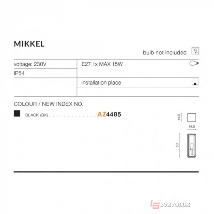 Коллекция: MIKKEL. IP защита: IP65. Цоколь / LED: E27. Количество источников света: 1. Материал: Пластик/Метал. Цвет: Черный. Мощность, W: 15. Напряжение, V: 220. Высота, cm: 50. Длина, cm: 14.5. Ширина (диаметр), cm: 14.5. Арт.: P46-AZ4485
