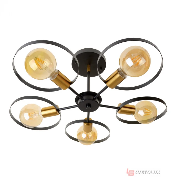 Люстра BL-789s/5 E27 BK+FG в стилі лофт прекрасно підійде в спальню, вітальню, зал, на кухню, для офісу, кафе, ресторану, готелю. Світильник розрахований на пять лампочок. Це можуть бути лампи розжарювання, енергозберігаючі або світлодіодні. Для роботи люстри необхідно встановити джерела світла з цоколем Е27 потужністю 60 Вт. Купити люстру на пять лампочок можна в Brille. Завдяки великому числу лампочок люстра дає насичений і яскраве світло. Люстра виготовлена з металу, пофарбована в чорний колір. Підстави для установки лампочок мають золотистий Колір. Цей світильник дуже стильний, прикрасить собою будь-який інтерєр. Люстра функціональна, досить потужна, забезпечує якісне освітлення кімнати. Кріпиться до стелі за допомогою монтажної планки.