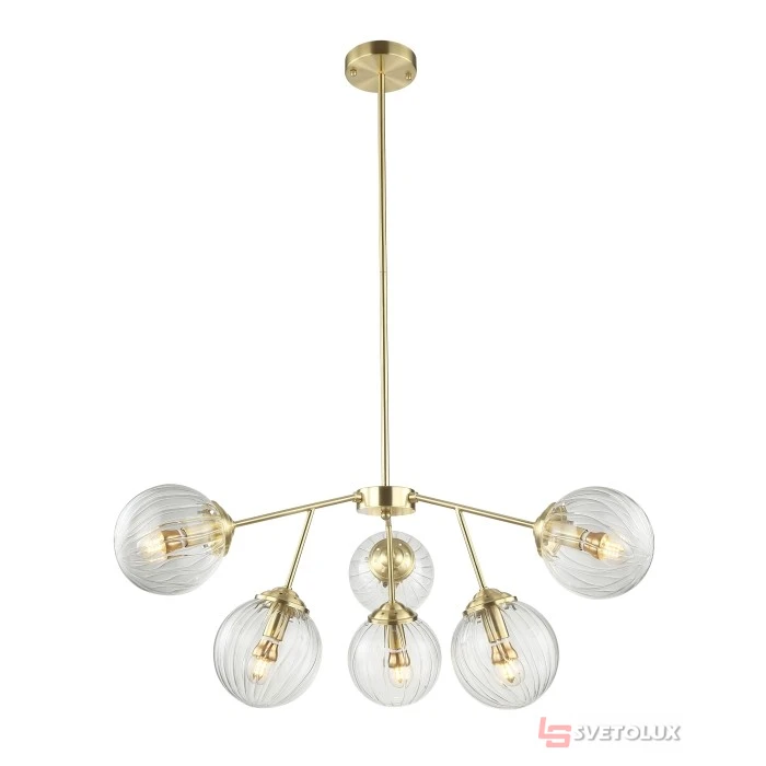 Колекція: 7400. Матеріал плафона: скло. Матеріал арматури: метал. Колір плафона: прозорий. Колір арматури: золотий. Стиль освітлення: лофт. Цоколь: E14. Тип кріплення: Підвісна люстра. Розмір: діаметр 750 мм, висота 1030 мм. Лампочки: E14 6 * 40W. Ступінь захисту: IP20. [7400-46] Арт.: P55-52430