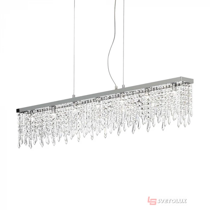 Арматупа з хромованого металу. Підвіски з восьмикутного і пірамідного кришталю з фацетом. Підвіси зі сталевими тросами регулюються по довжині. Розміри: L 1160 x H min 470 / max 1200 x P 90 mm. Лампочка: G9 max 7 x 40W. Клас захисту: IP20. Колекція: Giada collection. Арт.: P11-098739
