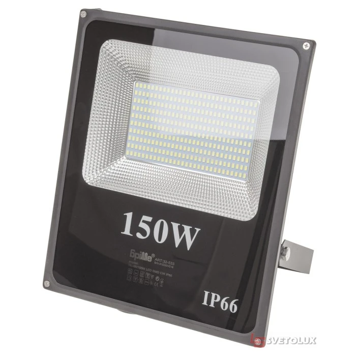 Світлодіодний прожектор HL-26/150W LED SMD CW IP65 – поза сумнівом, кращий освітлювальний прилад для великих приміщень виробничого призначення, а також вулиць, стоянок і мостів, який тільки могли придумати. Його потужний світловий потік здатний яскраво освітити простір при цьому економлячи електроенергію. Корпус світильника виготовлений з металу і загартованого скла, виконаний в квадратній формі. Завдяки наявності ручки, можна регулювати кут нахилу світильника і площу освітлення. Джерелом світла служать 300 світлодіодів типу SMD5730, які випромінюють рівне холодне біле світло зі світловим потоком 9000 лм під кутом 120°. Потужність світильника дорівнює 150 Вт, розрахований він для роботи в мережі змінного струму з номінальною напругою 220 В. Прожектор має гарний ступінь захисту оболонки IP66, що дозволяє сміливо встановлювати його на відкритих ділянках, дощ і сніг йому не страшні. Даний освітлювальний прилад забезпечить стабільну роботу протягом тривалого часу (близько 50 000 годин), а також високу якість освітлення і економію електроенергії.