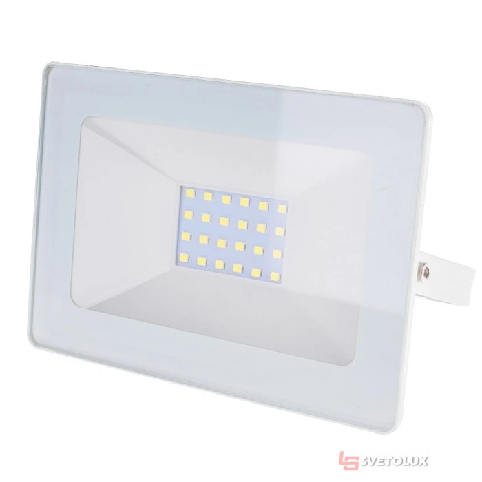Світлодіодний прожектор прийде на допомогу, коли потрібно освітити невелику автомобільну стоянку, спортивний майданчик, невеликий будівельна дільниця в темний час доби. Його компактний розмір дозволяє використовувати світильник всередині приміщень. Ультратонкий корпус, оточуюча форма роблять освітлювальний прилад стильним і сучасним. Світить він яскраво, довго, в будь-яку погоду, в будь-яку пору року, при цьому економлячи витрати на електроенергію. Корпус світильника виготовлений з металу і загартованого скла, пофарбований у білий колір. Захищений від проникнення всередину води і інших сторонніх твердих предметів, пилу (IP65). Обладнаний спеціальною ручкою, за допомогою якої здійснюється монтаж світильника до горизонтальної або вертикальної поверхні. За допомогою цієї ж ручки можна регулювати кут нахилу світильника, а, відповідно, й площу освітлення. Джерелом світла служать 24 світлодіоди, які випромінюють рівне холодне біле світло зі світловим потоком 80 лм. Світильник потужністю 30 Вт є еквівалентом галогенного світильника потужністю 300 Вт. Розсіює світло під кутом 120°, розрахований він для роботи в мережі 220 В. Даний прожектор не випромінює ультрафіолет, інфрачервоні промені, не містить важких металів і ртуті, екологічно безпечний.
